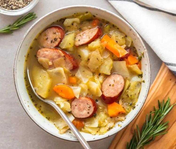 Heat oil in a Dutch oven over medium heat. Add kielbasa and cook, until browned, 8 to 10 minutes. Use a slotted spoon to transfer to a plate. Add onion, carrot, and cabbage to pot. Season with salt and pepper. Cook, stirring occasionally, until vegetables are softened, 5 to 6 minutes.
