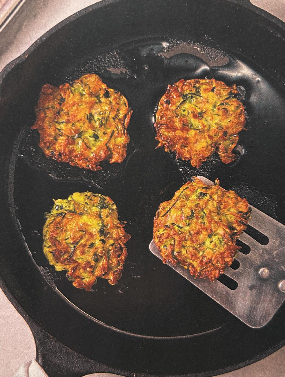 In a large nonstick skillet over mediumhigh heat, warm the oil. When the oil is shimmering, drop heaping scoops (about 1 Tablespoon each) of the fritter mixture into the skillet. Slightly flatten each fritter with the back of a spoon. The fritters will spread, so leave about 2” of space.