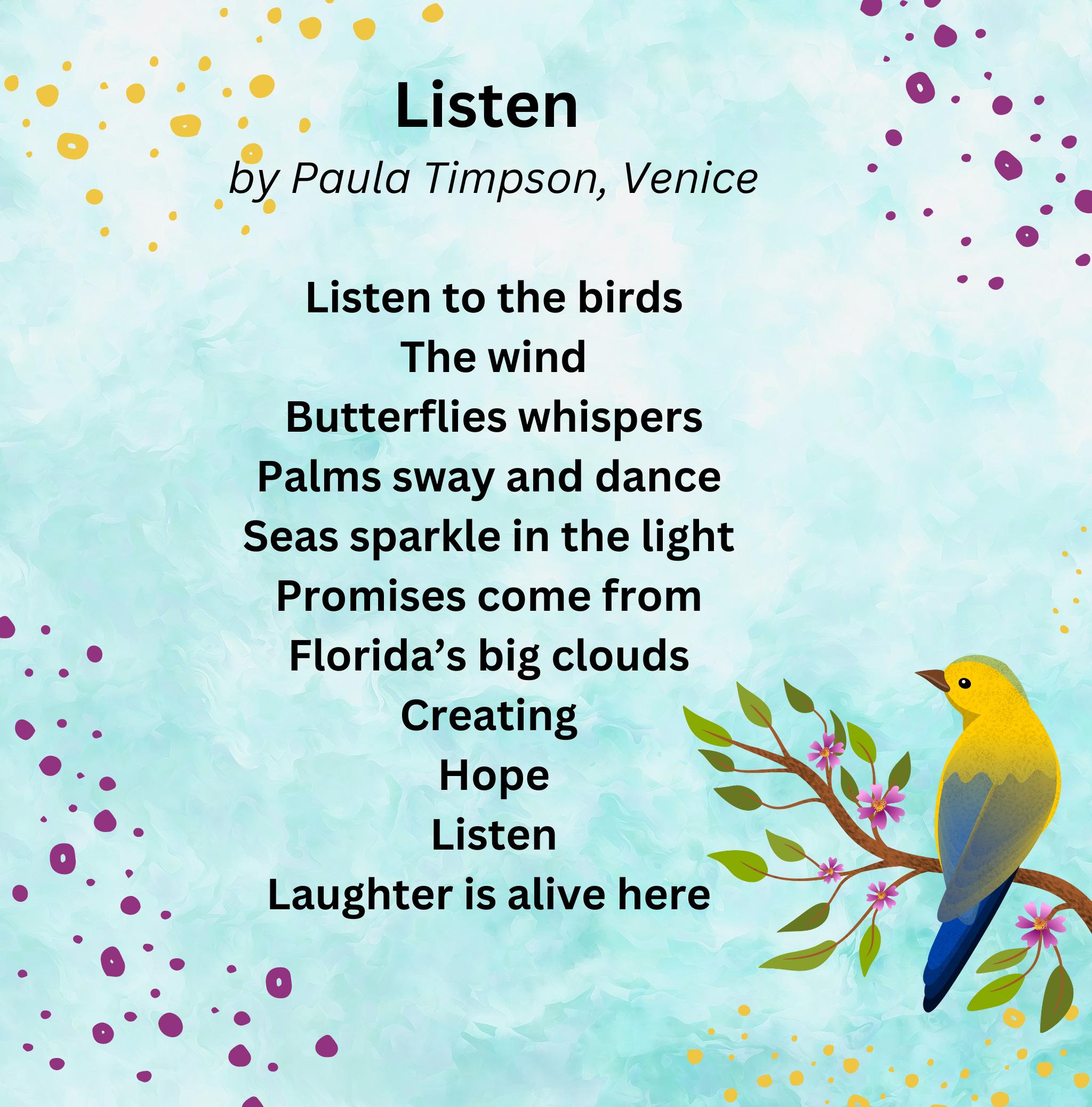 Send your short story or poem (150 words or less) or a photo of your artwork to Michele.Baker@ lifestylesafter50.com with the words “Creative Corner” in the subject line, or through our Facebook at www. facebook.com/LifestylesAfter50. Please include which Florida city you currently live in and your name. All creative pieces must be submitted before the 15th of every month, otherwise it will be held as potential news for the following issue’s publication. Artwork is published based on what space is available.