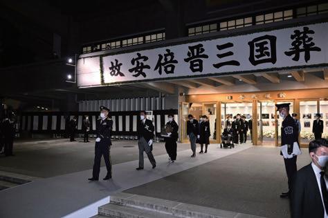 英国における日本報道 6 October 2022 vol.1612 www.news-digest.co.uk 5 国葬が終わり、安倍晋三元首相の遺骨を手に会場を出る喪主の昭恵夫人(左から3人目)ら。同2人目は岸田文雄首相= 9月27日午後、東京都千代田区の日本武道館[代表撮影] 「時事(JIJI)」