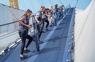 グ・エリアであるエンジェルの地下を ボートでひっそりと進む。トンネル上 部にときどき開いている、小さな空気 孔の穴から差す光以外は、ボートの小 さな明かりだけが頼り。全体の所要時 間は1時間弱で、旅のほとんどはトン ネルの中ではあるものの、ボートは屋 根付きなので悪天候でも楽しめる。ガ イドがトンネルと運河の歴史について 語ってくれる。 360度見渡せる ルーフ・トップに登る 「カメラは禁止、携帯はOK」な超身軽 な格好で臨む、約1時間30分のルー フ・トップ・ウォーク・ツアー。登る 場所は有名ミュージシャンのライブ が開催される国内有数のスタジアム、 O2アリーナ(The O2)だ。ガイドが 一緒に登りながら、グリニッジやカナ リー・ワーフなどランドマークを紹介 してくれるので、高いところが平気な 人にはぜひおすすめ。最高地点は地上 52メートルで、最大斜度は30度とか なりの急斜面を上り下りする。昼間、