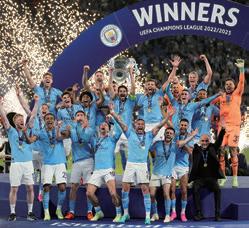 欧州チャンピオンズリーグを制し、優勝カップを掲げ喜ぶマンチェス ター・シティの選手たち