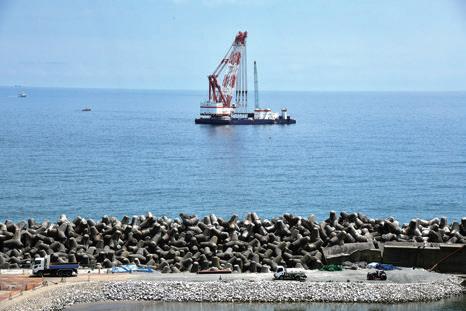 東京電力福島第1原発の処理水が放出される同原発の沖合。この日は放出口などが設置されている真上で専用の船が 工事をしていた=6月26日、福島県大熊、双葉両町[代表撮影]「時事」(JIJI)