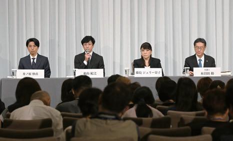 記者会見に臨むジャニーズ事務所の藤島ジュリー景子前社長(右から2人目)ら。同3人目は東山紀之新社長=7日、 東京都千代田区「時事(JIJI)」