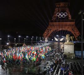 (パリ 7月27日 時事)パリ五輪が7月26日夜に開幕 した。パリでは1900年と24年に続き、100年ぶり3 度目の開催。市内中心部を流れるセーヌ川を舞台にし た開会式は雨の中、大勢の観客に見守られ、200を超 える国・地域の選手たちが船上で優雅にパレード。フ ランスのマクロン大統領が開会宣言し、聖火の最終点 火者は同国出身で柔道男子のテディ・リネール、元陸 上女子のマリジョゼ・ペレクさんの2人が務めた。