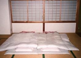 A Die ausgebreiteten Futons im japanischen Zimmer. Geschlafen wird auf dem Boden auf traditionellen Tatami-Matten.