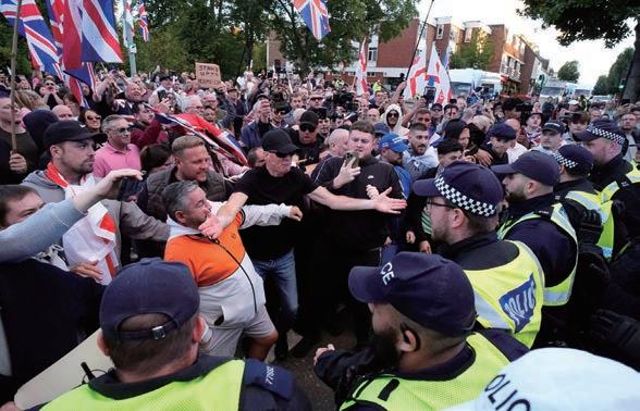 「追い出せ!」「外国人の犯罪者を強制送還させ ろ!」。8月23日と24日、英国各地でこんな文句 が書かれたプラカードを持った人々が、難民認 定申請者(Asylum Seekers)を受け入れてい るホテルの外で抗議デモを行いました。デモは ロンドン東部のエッピング、英南部ブリストル、 中部バーミンガム、北部リヴァプール、そして ウェールズやスコットランドでも発生し、ここ数 週間続いてきた収容ホテル前での定期的な抗議 デモが全国的なうねりとなっていることを示しま した。抗議に反対するグループも姿を見せ、治 安維持のために警察が出動。ホテル周辺には緊 張感が漂いました。