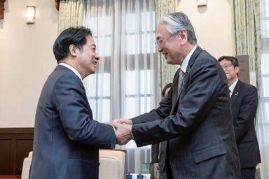 3月16日、台北の台湾総統府で、頼清徳総統(左)と握手する自民党の古 屋圭司前選対委員長[総統府提供]「時事通信」(JIJI)
