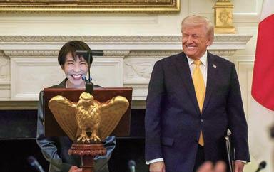 JAPAN NEWS ホワイトハウスで開かれた夕食会で笑顔を見せる高市早苗首相(左)と トランプ米大統領=19日、アメリカ・ワシントン「時事通信」(JIJI)