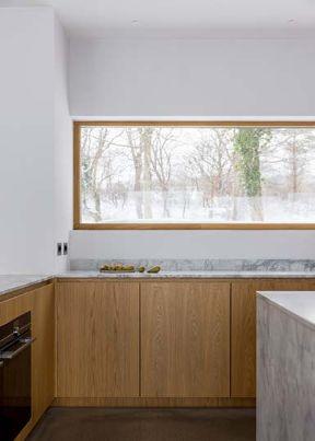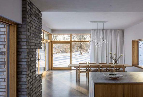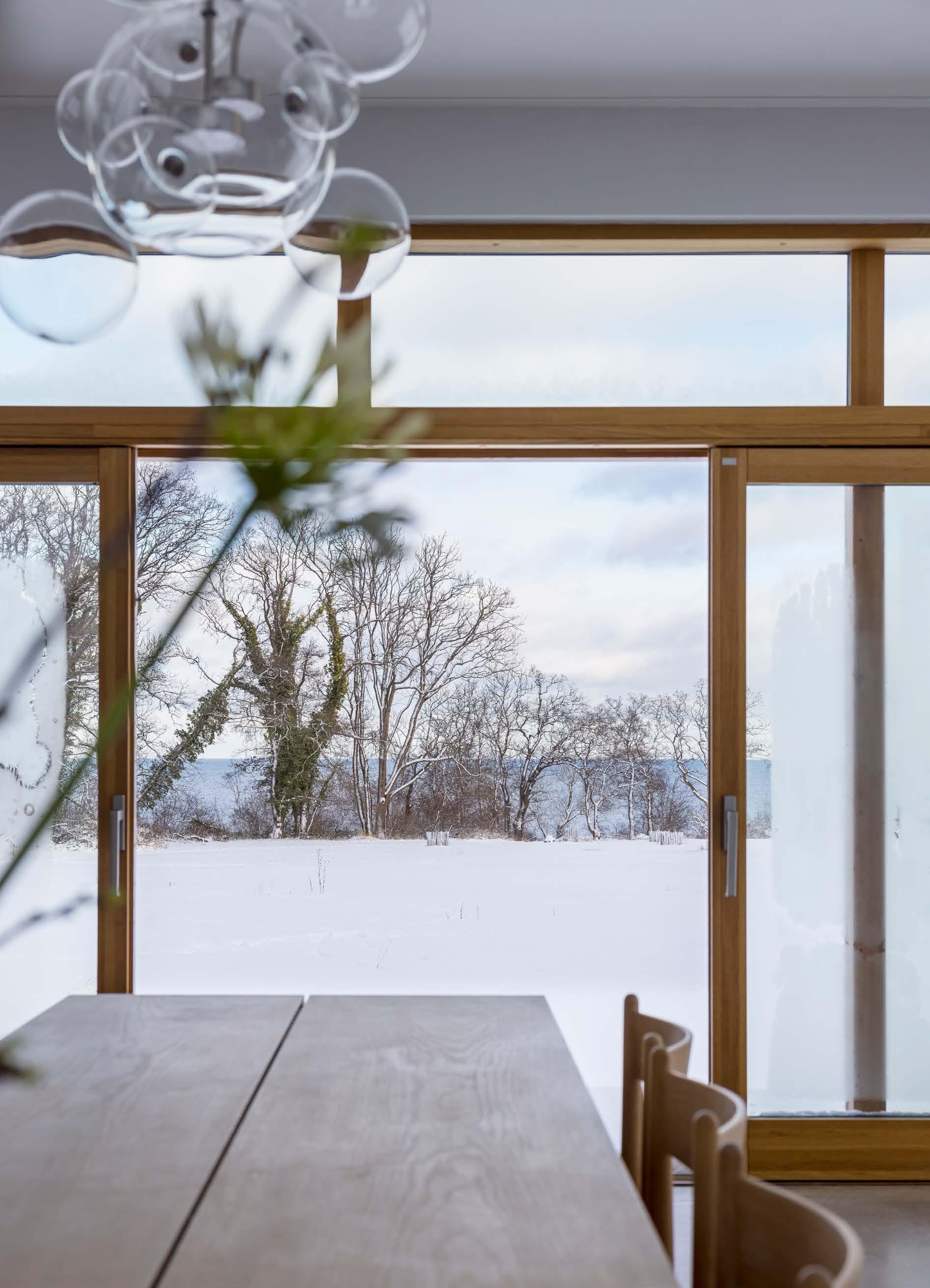 LUFTIGT. Vid matplatsen syns ett långt plankbord från Dinesen och stol CH36 från Carl Hansen. Fönster och skjutdörrspartier i oljad ek från Hajom.