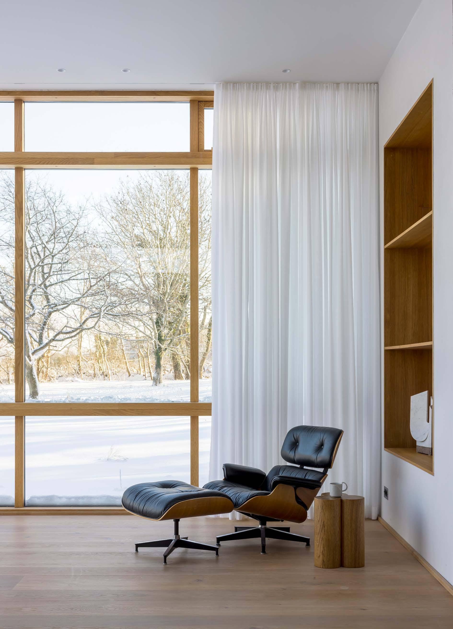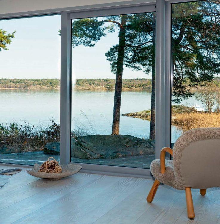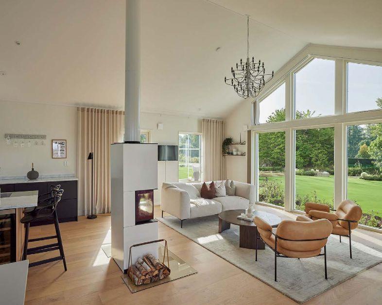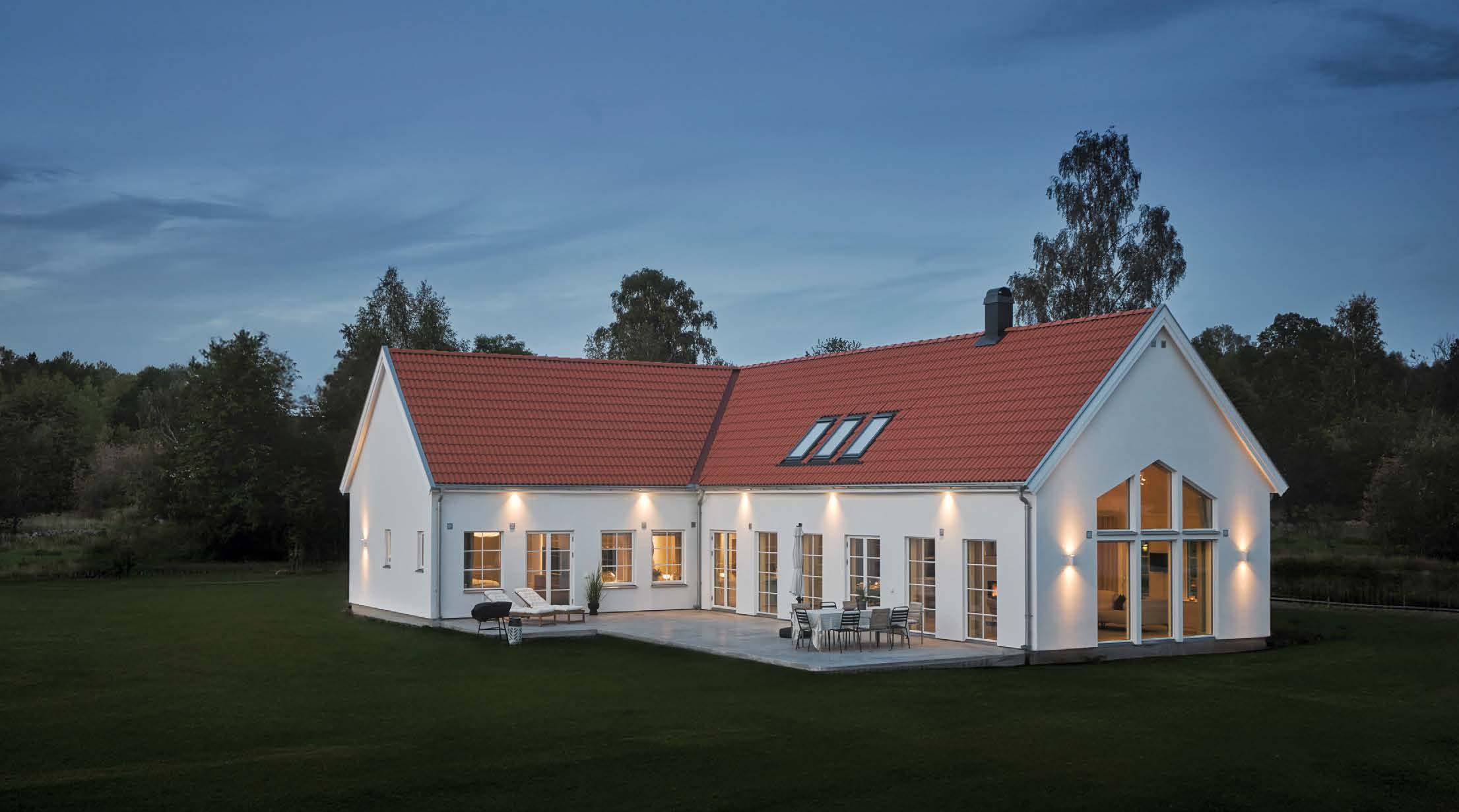 ”Arbetet med att återställa landskapet till en äng med vilda blommor mellan huset och havet startade redan 2016. Landskapsdesignern planerade även en mer traditionell trädgård mellan huset och vägen. Därtill har tre av taken täckts med sedum. Det skapar en kontinuitet från det yttre landskapet till husets insida”, säger Åsa Hjort. Inspirationskällorna till huset är flera. En arkitekt som Åsa Hjort återkommer till i sitt arbete är SIGURD LEWERENTZ Stjärnarkitekten ligger bakom flera byggnader i Skåne, bland annat operan och flera byggnader på Östra kyrkogården i Malmö. En annan gigant är CHARLES EAMES . Den amerikanska arkitekten och formgivaren står även för en av parets första gemensamma möbler; fåtöljklassikern ”Lounge Chair 670” från 1956.