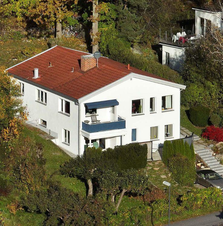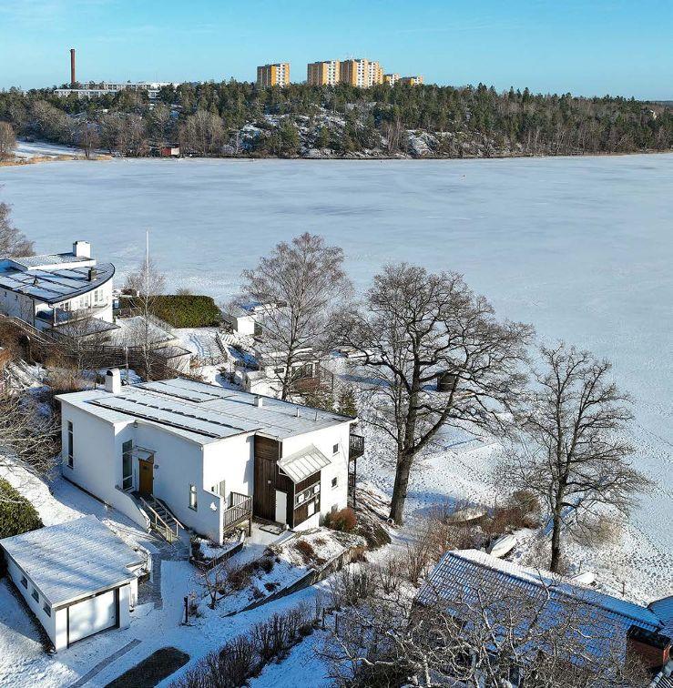 Villa i modern arkitektur med stora fönsterpartier samt vitputsad fasad. Stora altaner på båda våningsplanen sträcker sig längs med husets sjösida. Egen brygga och sjöbod.