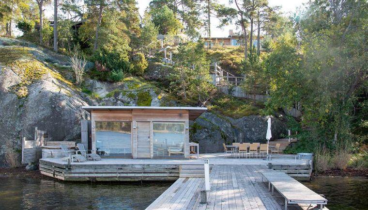Arkitektritat sjöställe med egen brygga.