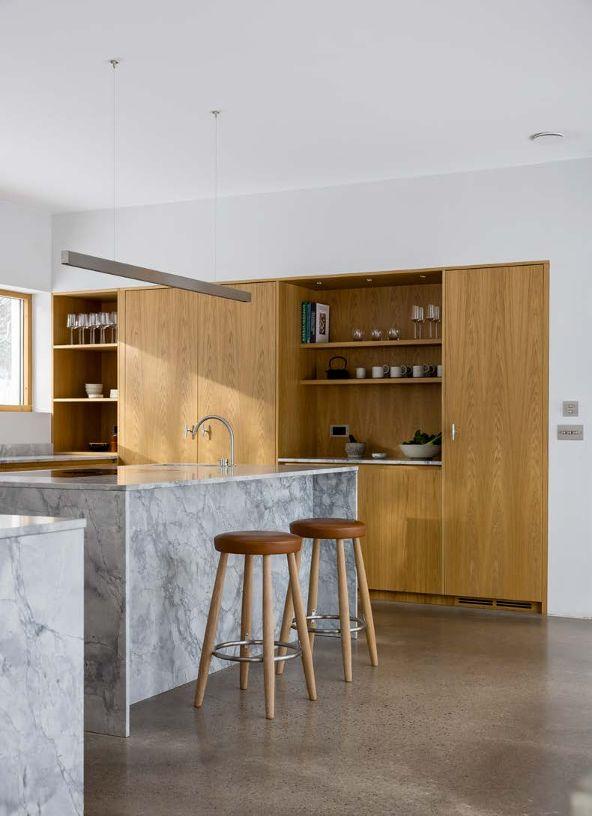 SOCIALT. Köket är ritat av ÅHA och tillverkat av Nordiska Kök. Köksbänken av kvartsit delar kök och matplats och används ofta vid middagar för att duka upp buffén. Det gråa teglet kommer från från Petersens Tegl. Konstverket i keramik är gjort av Hanna Järlehed.