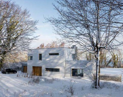Villan, som består av fem sammanlänkade huskroppar, har en yta på 275 kvadrat. Vid sidan av vardagsrum och ett stort kök med matplats finns fem sovrum – och ett ”litet filmrum för barnen”. Genomgående för huset, exteriört såväl som interiört, är känslan för detaljer och de omsorgsfulla materialvalen. Jämte betoningen på betong och ek syns grå kvartsit i köket och röd kalksten och diamantfräst kolmårdsmarmor i badrummen. Väggarna kring husets två öppna spisar kontrasterar med grått tegel från danska Petersens Tegl.