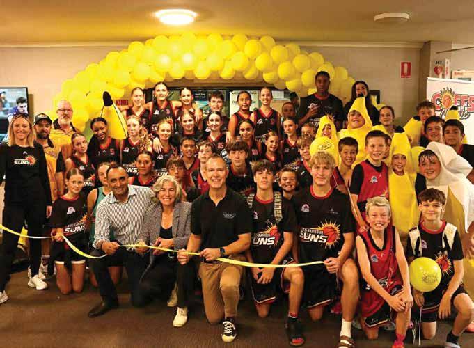 q Mayor Nikki Williams, Coffs Harbour MP Gurmesh Singh, and Big Banana CEO Michael Lockman open the 2026 Big Banana Coffs Classic, with excited Coffs Harbour Suns players standing by