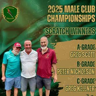 67 Nett, Ted Zawirski (32) 67 Nett & Fred Cox (21) 67 Nett. PUTTING COMP | Div 1 - Wayne Stedman (10) 29 Putts, Div 2 - Stephen Pilgrim (16) 27 Putts NEAREST THE PIN | 1st/10th - Graeme Valentine (13), 2nd/11thJohn Walker (11), 8th/17th - Ramsey Vane-Wood (6), 9th/18th - Robert Radin (19) MEMBERS DRAW | No.42, Jackpot, $123 MEMBERS EAGLES NEST | Unclaimed - 2 Balls 2025 MALE CLUB CHAMPIONSHIPS FINAL STANDINGS A-GRADE (<13) | Scratch Champion Greg Scott (5) 213 Gross (Play Off), Nett Champion Glenn Davies (6) 195 Nett B-GRADE (14-18) | Scratch Champion Peter Nicholson (15) 240 Gross, Nett Champion Peter Nicholson (15) 195 Nett C-GRADE (19-36) | Scratch Champion Greg Kellner (19) 253 Gross, Nett Champion Michael Croucher (21) 193 Nett TOM GOODMAN TROPHY (MEDAL OF MEDALS) | Winner Greg Sainsbury (20)