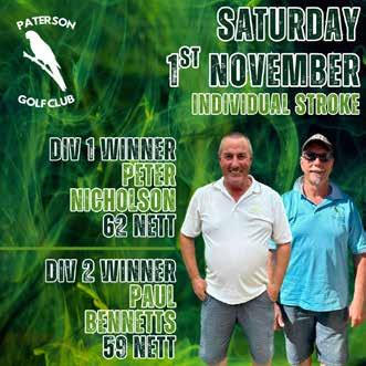 SATURDAY 1ST NOVEMBER INDIVIDUAL STROKE & MONTHLY MEDAL FIELD | 33 members DIVISION 1 (<15) | Winner Peter Nicholson (15) 62 Nett, Runner Up Paul Geddes (10) 62 Nett, 3rd Place John Walker (11) 64 Nett DIVISION 2 (16-36) | Monthly Medal & Winner Paul Bennetts (24) 59 Nett, Runner Up Brian Mowle (17) 61 Nett, 3rd Place Brian Wright (23) 62 Nett BALL