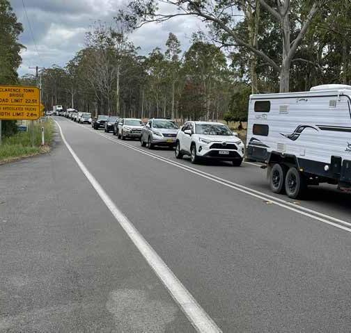 q Drivers queue, waiting to turn from Bucketts Way onto the Pacific Highway
