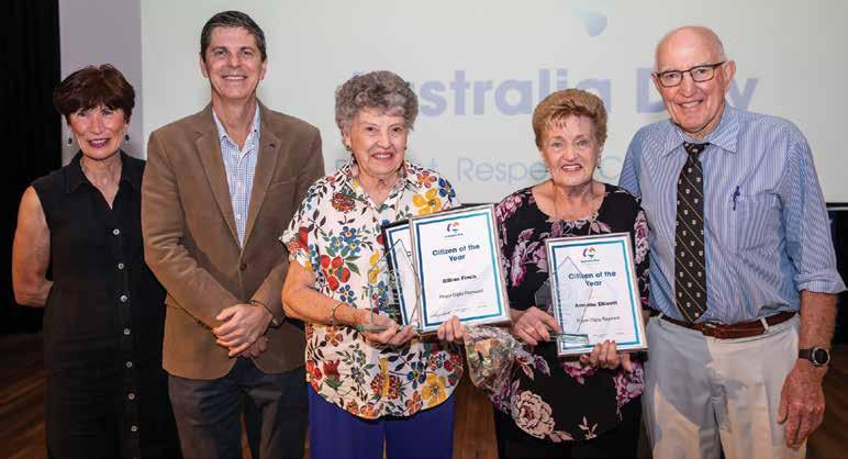 q Joint Citizen of the Year Gillian Finch and Annette Ellicott with Australia Day Ambassador Viv Kartsounis, MP Dave Layzell and Mayor Digby Rayward.