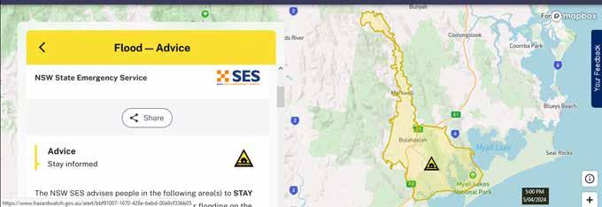 q Hazards Near Me clearly indicated the flood-watch advice as ‘Stay Informed’. The yellow on the map indicates the potential flood pattern of the upper Myall River, due mainly to bottlenecks and confluences along the way down from the mountains in the north.