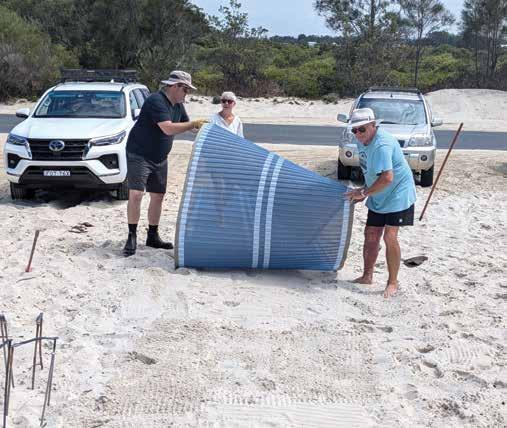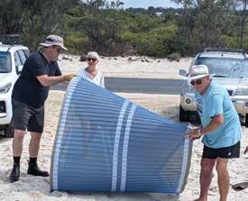 q HNTGPA Vice President Thomas, President Sandra, and Secretary Bruce manually re-rolling the MobiMats at Jimmys Beach. Photo: Sherrie O’Keefe.