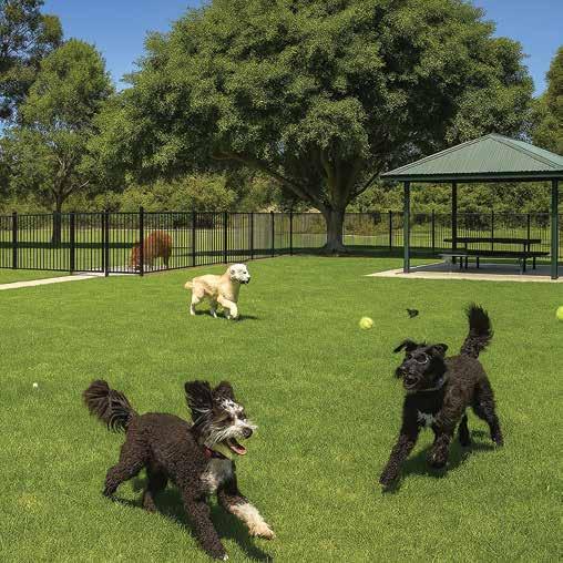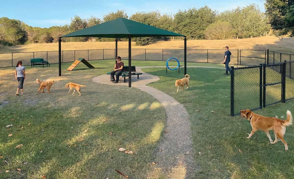 The dog park will feature fully fenced, secure areas, two separate play zones for small or timid dogs and larger or energetic dogs, covered seating, agility and basic training equipment, and a shaded, community-friendly design.