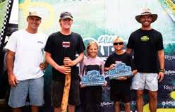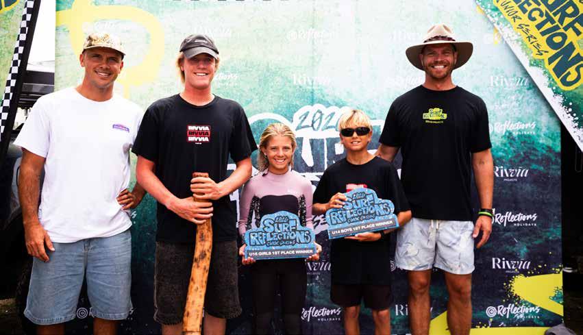 q Professional surfer Julian Wilson, Under 16s winner Hugo Spierings, Under 14s and Under 16s girls winner Alanni Morris, Under 14s boys winner Max Goold, and Reflections CMO Peter Chapman.