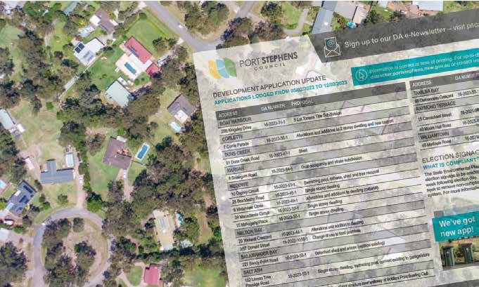 118A Soldiers Point Road 16-2023-40-1 Installation of roof structure over walkway at Soldiers Point Bowling Club Sign up to our DA e-Newsletter – visit pscouncil.info/development-applications COUNCIL NOTICES | portstephens.nsw.gov.au | 02 4988 0255 | council@portstephens.nsw.gov.au Please Note: Any submission or other correspondence received by Council may be released to any person making application to Council under the Government Information (Public Access) Act 2009. For further enquiries, please contact Council. DEVELOPMENT APPLICATION UPDATE APPLICATIONS LODGED FROM 05/02/2023 TO 12/02/2023 Information is correct at time of printing. For up-to-date information visit Council’s DA Tracker at datracker.portstephens.nsw.gov.au or contact us on 02 4988 0255. TANILBA BAY 88 Clemenceau Crescent 16-2023-53-1 Shed RAYMOND TERRACE 15 Carmichael Street 16-2021-967-2 S4.55(1A) Modification to approved place of public worship –design changes 80 Mount Hall Road 16-2023-42-1 Alterations and additions to school WILLIAMTOWN 49 Medowie Road 16-2021-1017-3 S4.55(1A) to approved amenities building – amend design ADDRESS DA NUMBER PROPOSAL Keep track of all things waste in one place, from bin days to kerbside collection – we’ve got you covered. Available for download on Android and Apple devices. new app! We’ve got a Port Stephens Waste Impact Apps Install ELECTION SIGNAGE WHAT IS COMPLIANT?