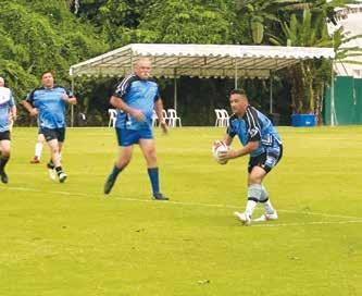 q Rookie Nelson Bay rugby centre Harry Anderson offloads during the Gropers’ 71-0 trial win over Epping Rams last Saturday at Bill Strong Oval with co-centre Scott Tristan in support.