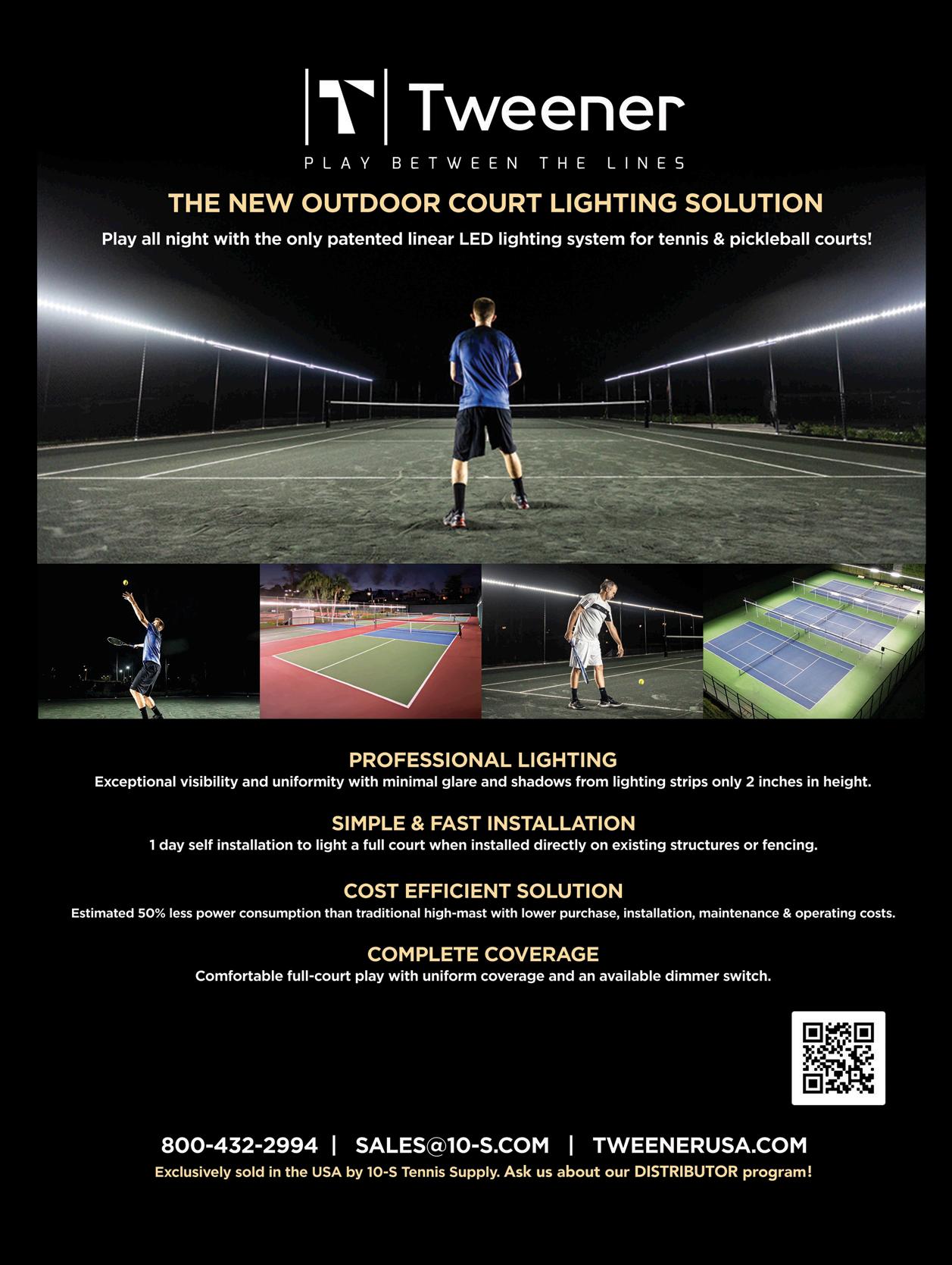 1 TOURNA Upgraded 650-ES A full electronic, constant pull machine now with upgraded CNC precision clamps. The true value monster, loaded with features, to make stringing faster and easier. uniquesports.us/product-category/tennis/ 2 My Court Caddy My Court Caddy is the only tennis ball holder you’ll ever need. It is the tennis player’s home base for balls, towels, water bottles, or anything else. My Court Caddy easily attaches to any chain link fence! It holds two tennis balls or like-sized objects, and features two hooks for towels and other gear, as well as a carabiner for water bottles and sports drinks. mycourtcaddy.com 3 Theragun mini Theragun mini is your pocket-sized partner, giving you Theragun quality muscle treatment with unparalleled portability. teamhqs.com 4 TOURNA Ballport The TOURNA Ballport 120 with Wheels. One hundred and twenty tennis balls are heavy. Remember, you’re a tennis player, not a weightlifter. Make your life easier with the TOURNA Ballport 120 with wheels so you can roll it around the court and back to your car. uniquesports.us/productcategory/tennis/