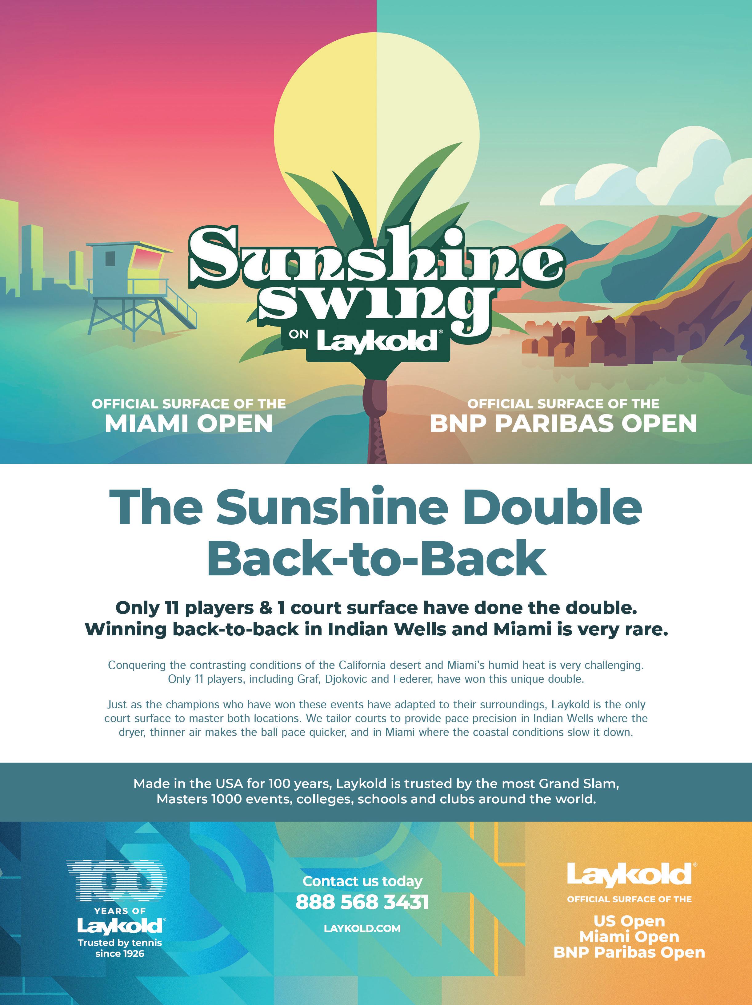 wide. This shift helped democratize the sport and accelerate its global expansion. Without hard courts, tennis would likely have remained a niche sport confined to private clubs. Today, Laykold is the surface of choice for leading tennis events around the world, including the US Open, Miami Open, BNP Paribas Open at Indian Wells, Abu Dhabi Open, Wuhan Open, Mexican Open, and numerous ATP, WTA and ITF tournaments globally. Visit laykold.com.