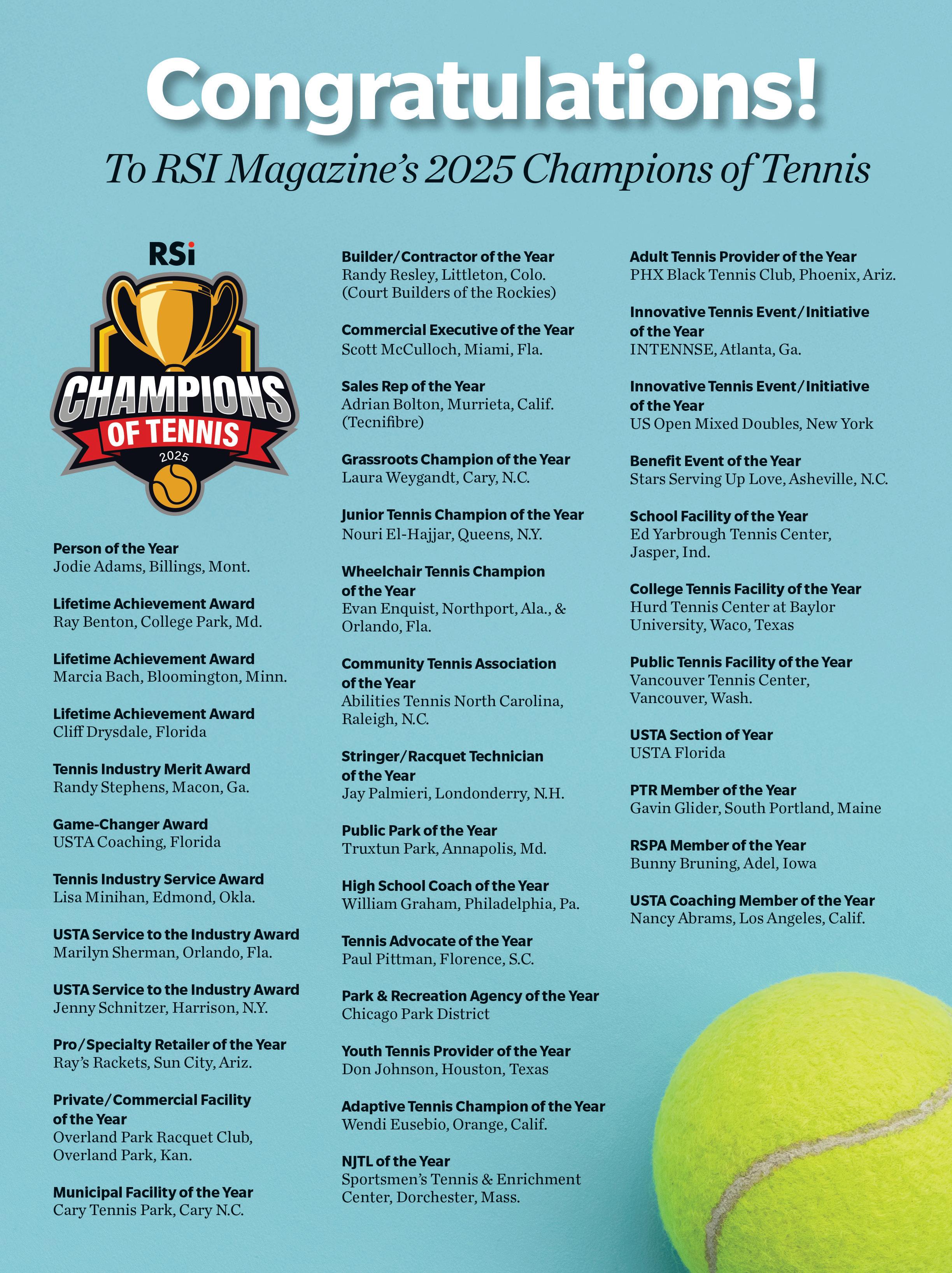 In RSI’s January issue, an ad on page 26 listed incorrect sections for two of RSI’s Champions of Tennis winners: Stringer of the Year Jay Palmieri is in the USTA New England Section and Adaptive Tennis Champion of the Year Wendi Eusebio is in USTA Southern California. Also, on page 40, the name of the store owner for our Pro/Specialty Retailer of the Year should be Ray Wendeln. These corrections were made in our digital edition at tennisindustrymag.com.