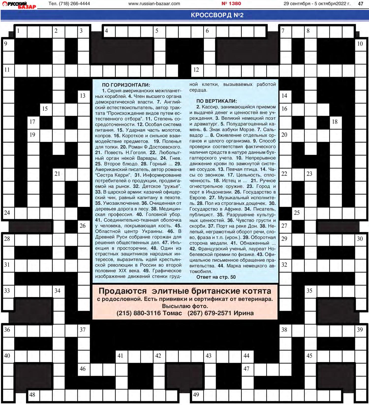ÎÒÂÅÒÛ ÍÀ ÑÓÄÎÊÓ,ÊÐÎÑÑÂÎÐÄÛ,×ÀÉÍÂÎÐÄ / ÊÂÀÄÐÀÒÛ 50 29 ñåíòÿáðÿ - 5 îêòÿáðÿ 2022 ã. ¹ 1380 www.russian-bazaar.com Òåë. (718) 266-4444 Êàæäîå ñëîâî-îòâåò â êðîññâîðäå èìååò îäèíàêîâîå çíà÷åíèå ïî ãîðèçîíòàëè è ïî âåðòèêàëè è ïðèíàäëåæèò îäíîé è òîé æå öèôðå 1.×ÀÊ.