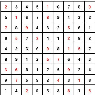 Çàïîëíèòå ïóñòûå êëåòêè öèôðàìè îò 1 äî N (N çàâèñèò îò ðàçìåðà ñåòêè) òàê, ÷òîáû â êàæäîé ñòðîêå è â êàæäîì ñòîëáöå âñå îíè áûëè ðàçëè÷íû.