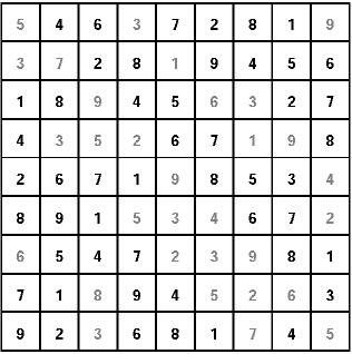«Ñóäîêó» ïðåäñòàâëÿåò ñîáîé ìàòðèöó ñ ÿ÷åéêàìè 9õ9, êîòîðàÿ ðàçäåëåíà íà áîëåå ìåëêèå ñåêòîðû ðàçìåðîì 3õ3. Äëÿ ðåøåíèÿ ãîëîâîëîìêè íåîáõîäèìî, ðóêîâîäñòâóÿñü ëîãèêîé è ðàñ÷¸òîì, ïîäîáðàòü íåäîñòàþùèå öèôðû îò 1 äî 9. Ñäåëàòü ýòî íóæíî òàê, ÷òîáû êàæäàÿ öèôðà ïðèñóòñòâîâàëà, íå ïîâòîðÿÿñü, â êàæäîì ðÿäó, êàæäîé êîëîíêå è êàæäîì ñåêòîðå. Ïðàâèëüíî çàïîëíåííàÿ ìàòðèöà îçíà÷àåò: âû - ïîáåäèòåëü! Ïîìíèòå, ÷òî, ðàçãàäûâàÿ «Ñóäîêó», âû ïîëó÷àåòå âîçìîæíîñòü ñîâìåñòèòü ïðèÿòíîå ñ ïîëåçíûìíàòðåíèðîâàòü âíèìàíèå è ëîãèêó, à òàêæå äîêàçàòü, ÷òî âû âèðòóîç