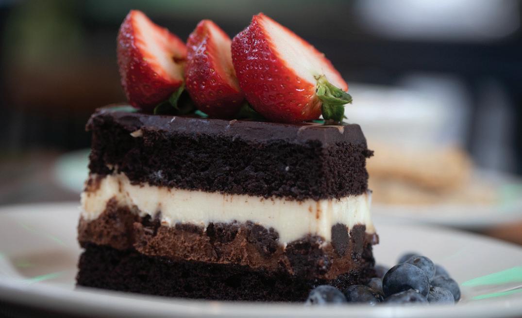 I tried the tuxedo cake. “That’s the chocolate mousse cake made of chocolate and cacao. The white layer is made of ground sunflower and cashew milk. It’s three-layer. It’s gluten free and vegan,” Perera says.