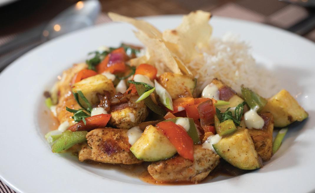 The chicken is flavorful and cooked to perfection. The spices don’t overwhelm the dish.