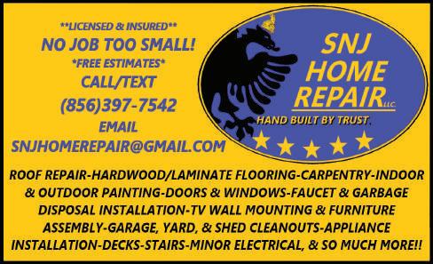 NJ HIC. #13VH00102300 Oil Tanks NM-00000479 Open & Working 7 Days A Week OUR 35TH YEAR IN BUSINESS Remodeling, Carpentry & Handyman Services NO JOB TOO SMALL Need a Handyman? 40 Tim’s Nailed It Construction -Flooring -Gutters/Cleaning -Power Washing -Handyman Free Estimates 609-678-6971 609-509-9577 Eric’s Handyman Service Your list is our list 856-889-6235 Featured “A” rating on Angie’s List NM-00000972 Steve’s Home Repair Siding • Capping • Painting Gutters • Carpentry & More (856) 810-2182 steveshomerepairplus.com NM-00016841 TONY’S HOME IMPROVEMENT Roofing • Soffit • Siding • Gutters Fascia Boards • Tiles • Laminate Flooring • Fences Painting • Drywall • Chimney & Chimney Repair Concrete Work • Stocko and More 856-304-3916 13VH06957800 ATLAS, LLC 856-571-1622 • Interior Renovations • Flooring • Tiling • Painting • Trim Work • Kitchens & Baths • Home Repairs General Home Repair CARPENTRY - DOORS PAINTING, ETC. No job too small Jim Incognito 609-870-3518 NM-00023552 FAMILY OWNED AND OPERATED FOR OVER 30 YEARS! (888) 463-3628 TERMITES • MOSQUITO • BEES LARKIN LANDSCAPING Shrub Removal * Design * Planting * Topsoil * Grading * Mulching * Stone Beds * Lands Ties * In-ground Drainage * Lighting * Decorative & Retaining Walls * Paver Patios & Walks * Sodding * Evergreen Screening Sprinkler Repairs OVER 40 YEARS EXPERIENCE 856-234-6424 NM-00024910 NM-00017374 For all your Landscaping & Irrigation Needs 856-753-7007 856-627-5510 Lic# 13VH00991700 shipshapelandscape.com Handypersons Home Improvements Home Improvements Home Improvements Home Improvements Commercial • Residential Full service termite, pest, mosquito control. Medford: (609) 953-5444 • Tabernacle: (609) 268-1002 • Marlton: (856) 988-0518 “Safeguarding Your Home & Environment” Since 1985 SafeGUARD SERVICES, INC. 1603 Route 206 Tabernacle TERMITE AND PEST CONTROL GENTILI PAINTING & POWER WASHING LLC 856-228-2723 www.gentili-painting.com Insured Reg. #13VH00966900 Home Improvement Exterminating 609.914.0517 A1 CUSTOM PAINTING Neatness Counts Interior/Exterior • Wallpaper Removal • Install Vinyl Plank Flooring • Skim Coat • Power Wash Fully Insured/Free Estimates #13VH04329600 10% OFF ANY COMPLETE JOB • Interior/Exterior • Wallpaper Removal • Install Vinyl Plank Flooring • Skim Coat • Power Wash • Sheetrock Repair 856-456-8232 • 856-384-8734 Free Estimates Full Insured Int / Ext / Res / Comm Prof. Spray Aluminum Siding, Stucco, Shingle Powerwash Deck Clean Reg. #13VH01299900 Painting/Wallpapering Painting/Wallpapering Painting/Wallpapering Painting/Wallpapering BRITMAR Wallpaper&Painting Resid.&Comm.•Int.&Ext. NeatnessGuaranteed NoJob TooSmall FREEEstimates•FREESizing WALLPAPERREMOVAL 856-582-2459 Lic#13VH08937100 POWER WASHING SPRING SPECIALS HOUSE WASHING WITH FREE WINDOW WASHING • Soft Washing • House • Townhouse • Condo • Vinyl • Aluminum • Stucco • Concrete • Pavers • Fences • Roofs Fully Insured • Free Estimates 609-217-3424 Americanpowerwashingsj.com Soft Washing Specialist Power Washing Free Est. • NJ#13VH0325100 Houses...Decks...Patios Low Pressure Power Washing Specialist HANDS ON DECK LLC 856-428-9797 Roofing/Siding TO ADVERTISE, CALL 856.779.3800, EXT. 8103 10 THE CINNAMINSON SUN — JUNE 5-11, 2024