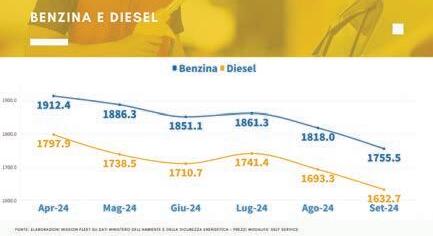 Ilgraficodeiprezzidellabenzinaedelgasolio, mostraun andamentodecrescente.Apartire daaprile,ognimesec’èstatoundecremento deiprezzideicarburantirispettoaaimesi precedenti(conlasolaeccezionediluglioincui ildieselèsalitodell’1,8%,mentrelabenzinaè increscitadello0,6%).Adaprileilprezzoalla pompainmodalitàself-serviceèstatodi €1,912allitroperlabenzinae€1,798peril gasolio.Seimesidopo,asettembre,labenzina haraggiuntoilprezzodi€1,755allitromentre ilgasoliodi1,633.Neiseimesiconsideratii prezzisonodiminuiti mediamentedell’1,7% perlabenzinaedell’1,9%perilgasolio