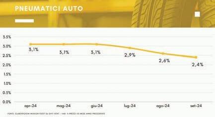 Iprezzi continuanoadaumentare nelsemestre consideratointabella,ancheseladinamicadei livellidicrescitaèdiscendente.Adaprilei prezzideglipneumaticisonoaumentatidel 3,1%,taleincrementoèrimastocostantefinoa giugno,dopodichelacurvahainiziatoa inclinarsiversoilbassomostrandoincrementi inferiori.Aluglioiprezzisonoaumentatidel 2,9%mentre,adagostodel2,6%eperfinirea settembredel2,4%.Varilevatochel’aumento ècorrelatoaicostidiretticomel’aumentodei prezzidellematerieprimenecessarie,nonché aicostidiproduzioneedilogistica.