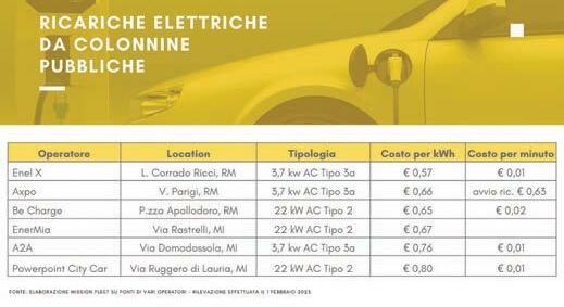 Latabellaevidenziaiprezzidellericariche dellevettureelettrichepressoalcune colonninepubblichedellecittàdiRomae Milanodidiversioperatori.Icostidelle ricarichemostranol’importoperminutoeil costodiricaricaperkWheancheilcostodi avviodellaricarica.