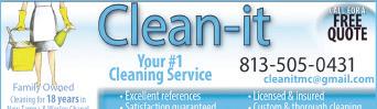 PATY CLEANING SERVICE. Comm’l or resid’l cleaning service. We have our own supplies & 6 years of exp. Free estimates. Call 813 943 6054 or email patycleaningservice@hotmail.com.