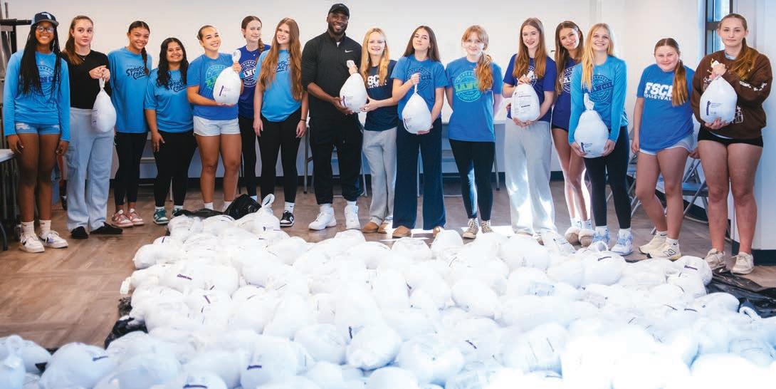 The volleyball squad also helped load the bagged turkeys onto a long series of tables outside the Sports Campus, so Nelson could personally deliver them to the vehicles that pulled up in the parking circle at the front entrance of the facility to receive them, usually offering to give anyone who said it was their first time ever making a turkey (or if they said they had a friend