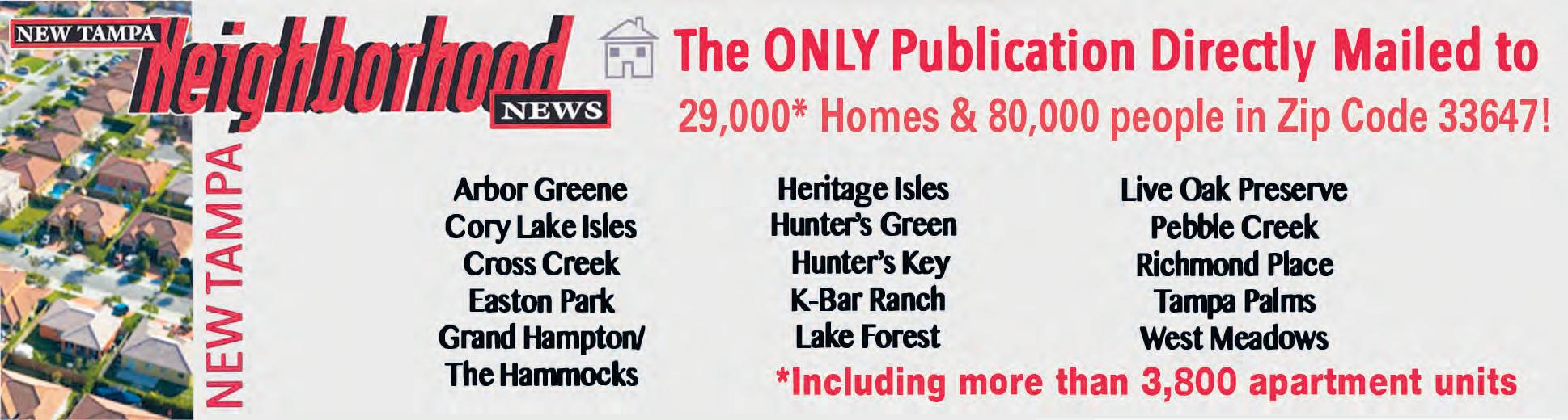 New Tampa Neighborhood News reserves the right to edit and/or reject any advertising. New Tampa Neighborhood News is not responsible for errors in advertising beyond the actual cost of the advertising space itself, nor for the validity of any claims made by its advertisers.