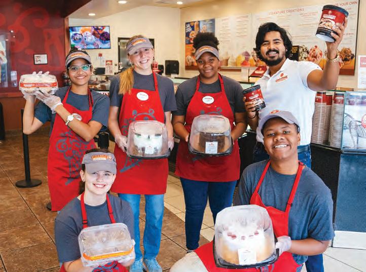 To illustrate his point, he adds, “Every time someone walks in, we make sure every team mem ber yells, ‘Welcome to Cold Stone!’ (Yes, they also sing songs for tips!) And, watching the crew mix in your favorite toppings on our cold stone counter is always fun, too. And, we stand behind our ice cream as the best, too!”