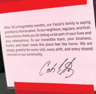 Owner Carlos Saenz attached a note to the door that says “After 18 unforgettable months, our Fazoli’s family is saying goodbye to this loca tion.” Fazoli’s received a share of the $1 million in post-hurricane grants from the Glazer Family Small Business Fund less than a year ago, but apparently, that was not enough to help save the restaurant, which shared the plaza with Los Cha pos Tacos and Lightning Orthodontics