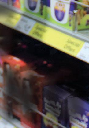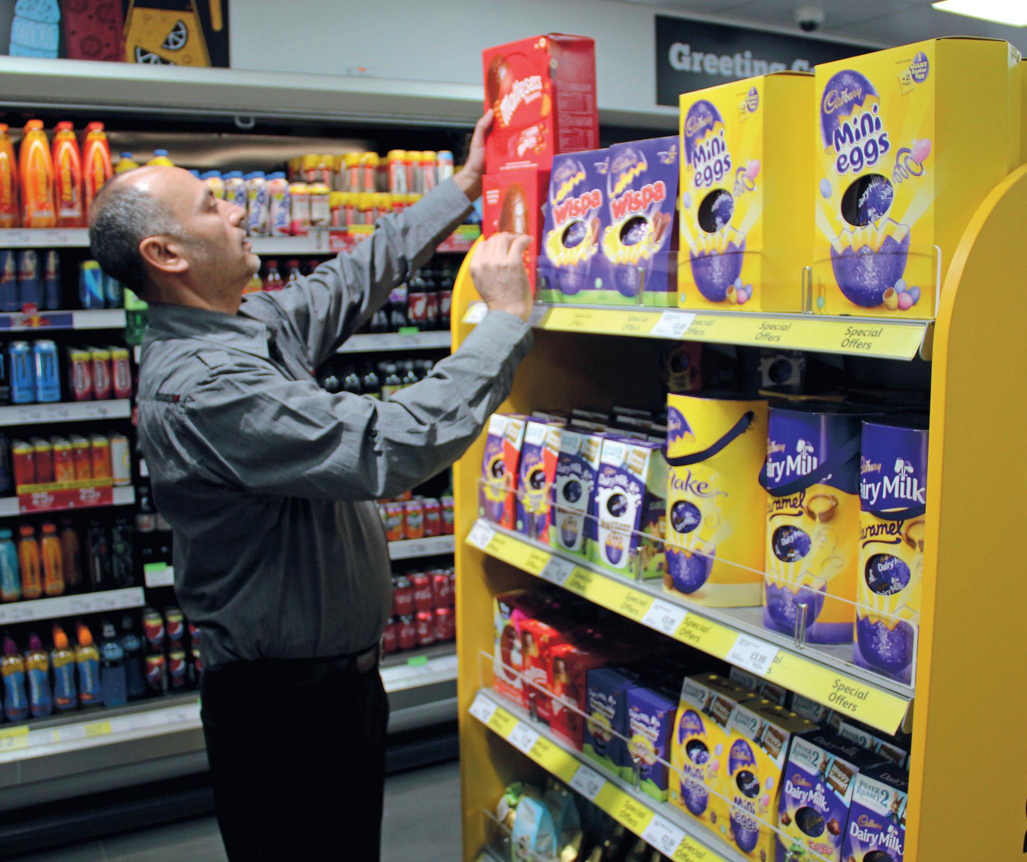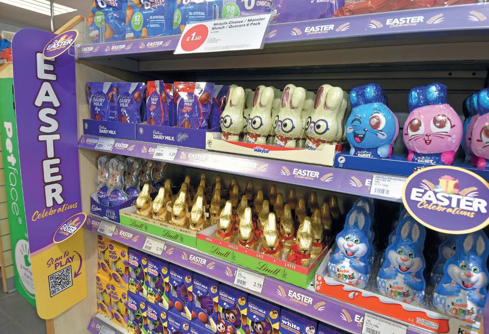 Easter in dedicated bays at the front of the shop. “This brings these occasions to mind,” he says. He displays Creme Eggs at the till with other lowerprice items, but stresses that people get blind to these items if they are not refreshed, so he maintains a rotation of lowerpriced items. He also creates a bit of theatre around the displays, such as balloons for Valentine’s Day.