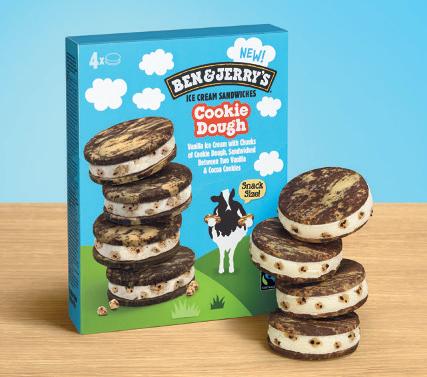 Cookie Dough Ice Cream Sandwich features two soft vanilla-and cocoa-swirled cookies either side of vanilla ice cream packed with chunks of cookie dough. It uses the same �lavour as Ben & Jerry’s number-oneselling pint variant, as the supplier