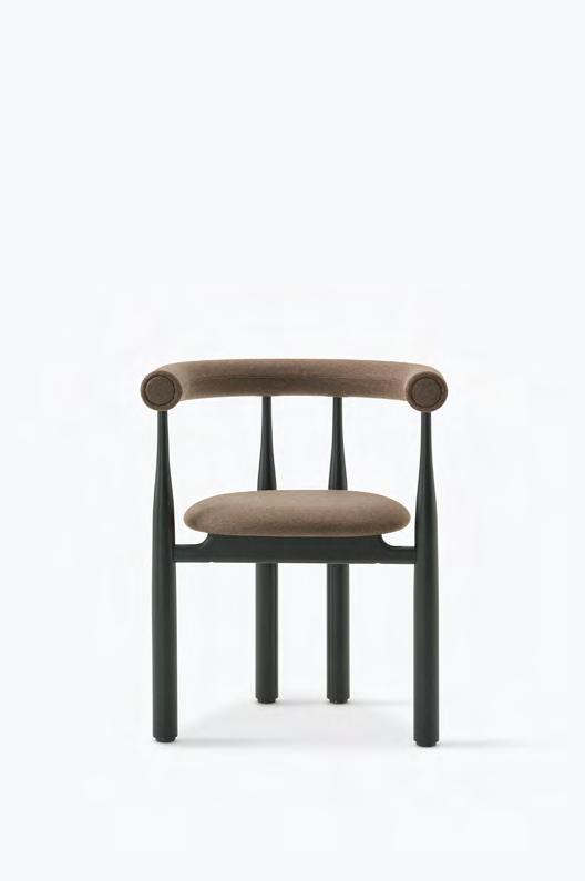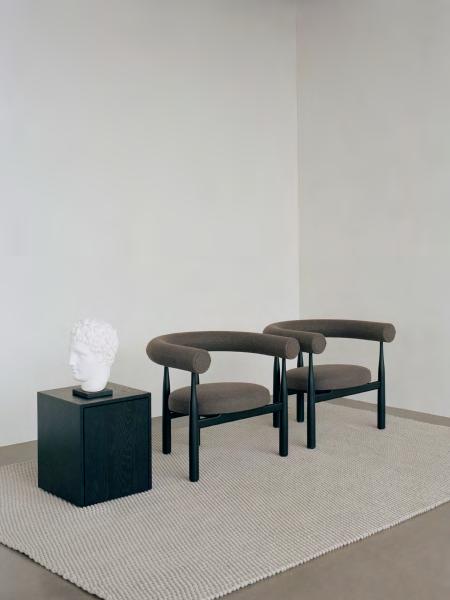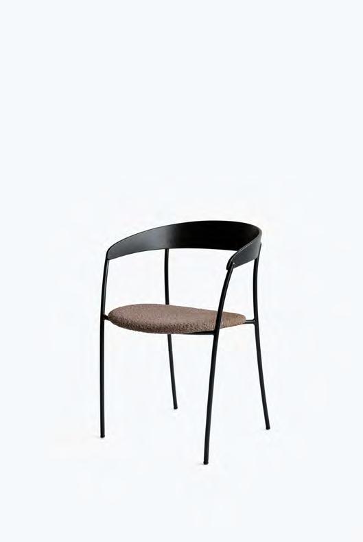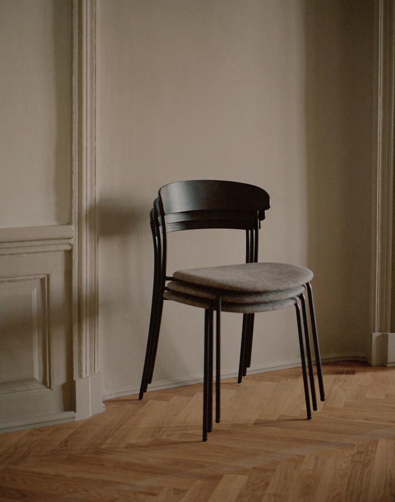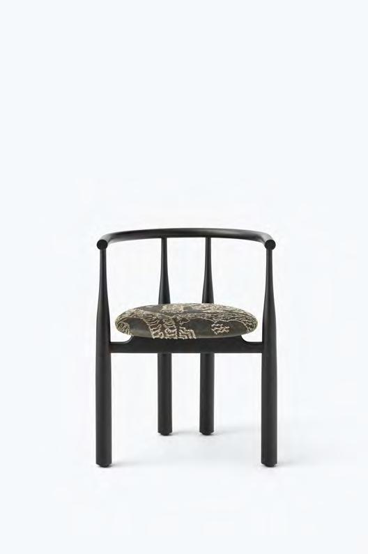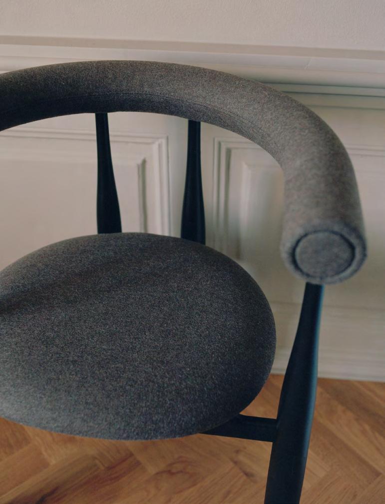 Black painted beech, upholstery, shown with Nevotex, Wooly Plus, 1008